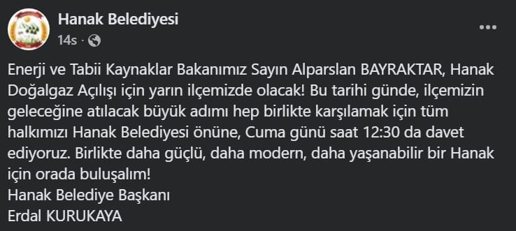 Hanak halkı, ilçenin tarihinde bir ilk olacak doğalgazın verileceği günü bekliyordu. Hanak Belediye Başkanı Erdal Kurukaya, dün yaptığı bir açıklamayla, “Enerji ve Tabii Kaynaklar Bakanımız Sayın Alparslan Bayraktar, Hanak Doğalgaz Açılışı için yarın ilçemizde olacak! Bu tarihi günde, ilçemizin geleceğine atılacak büyük adımı hep birlikte karşılamak için tüm halkımızı Hanak Belediyesi önüne, Cuma günü saat 12:30 da davet ediyoruz” diyerek tüm ilçe sakinlerini bu önemli etkinliğe çağırmıştı.