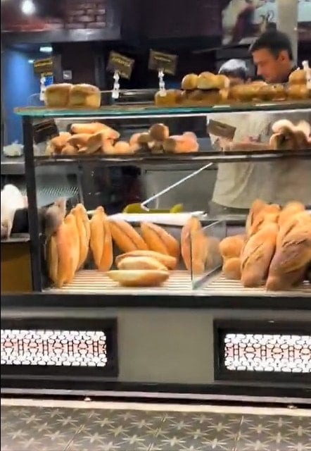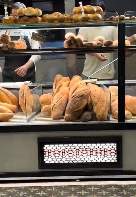 Görüntülerde, vitrindeki ekmeklerin arasında rahatça dolaşan fare açıkça görülüyor.