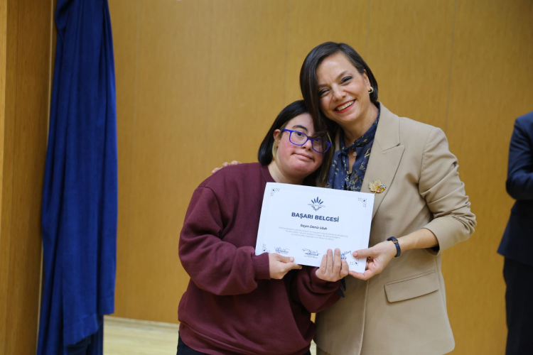 İZMİR (İGFA) – İzmir Karabağlar Belediyesi Mobilya Akademi ve Karabağlar Kent Konseyi işbirliğiyle “Dünya Engelliler Haftası” kapsamında 6 ay boyunca “Sürdürülebilir Tasarım Atölyesi” eğitim programına katılan özel gereksinimli bireylere sertifika töreni ve “Ezber Bozan Tasarımlar” sergisi düzenlendi.