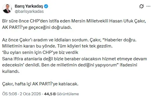 Gazeteci Barış Yarkadaş, Hasan Ufuk Çakır’ın AK Parti’ye katılacağını iddia etti. Kendisiyle konuştuğunu belirten Yarkadaş, sosyal medya hesabından yaptığı paylaşımda şu sözlere yer verdi: “Mersin Milletvekili Hasan Ufuk Çakır, bir süre önce CHP’den istifa etti ve AK Parti’ye katılacağını doğruladı.”