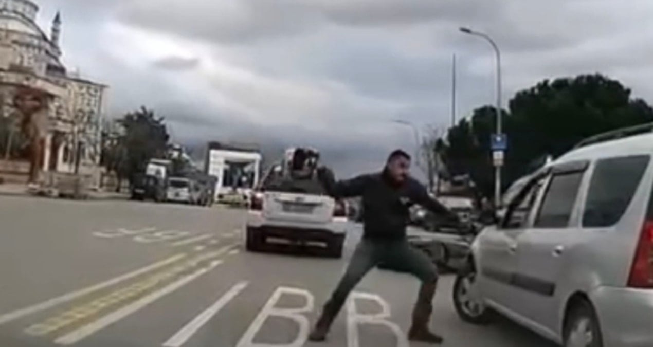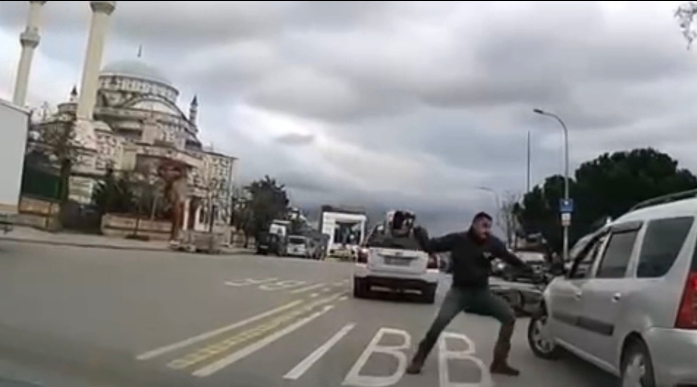 Yaşanan gerginlik sırasında hafif ticari araç sürücüsünün aracını motosikletlinin önüne kırdığı, motosiklet sürücüsünün ise araca tekme atmaya çalıştığı görüldü. Yolun ilerleyen bölümünde duran motosiklet sürücüsü, elindeki kaskla hafif ticari araca vurdu.