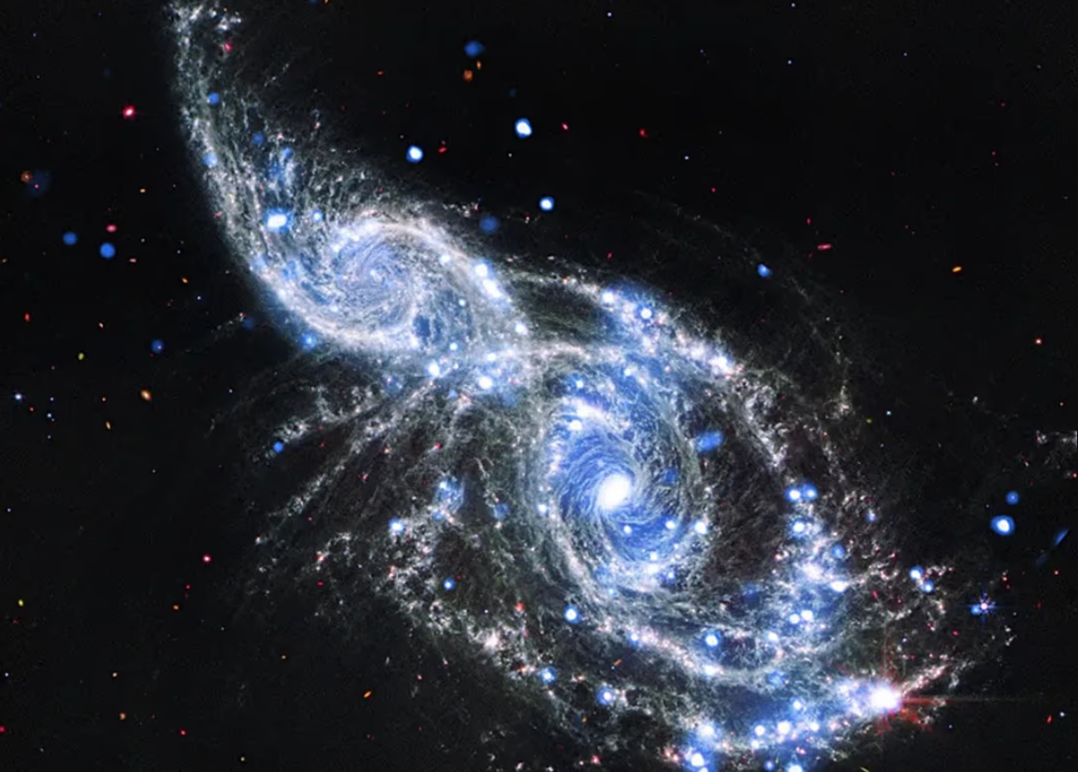 Görüntüde JWST’nin orta kızılötesi verileri beyaz, gri ve kırmızı tonlarında yansıtılmış; bu veriler galaksilerin çekirdekleri ve spiral kollarındaki daha soğuk toz ve maddeleri takip etmeye yarıyor. Öte yandan, Chandra’nın X-ışını verileri ise mavi tonlarla gösterilerek en enerjik bölgeleri öne çıkarıyor.