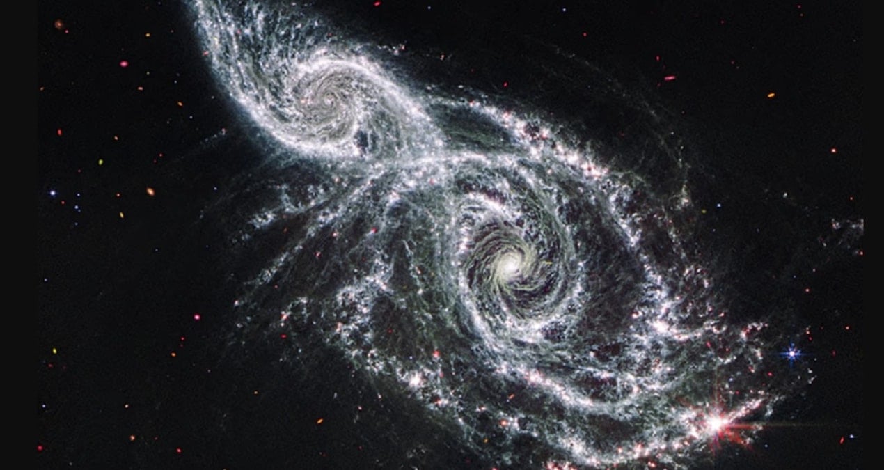Görüntüde yer alan galaksiler NGC 2207 ve IC 2163, bir yerçekimi dansına kilitlenmiş durumda birbirlerine doğru sürükleniyor. Daha büyük olan NGC 2207, görüntünün merkezinde baskın şekilde yer alırken, daha küçük olan IC 2163 onun dış kenarına doğru örtüşüyor. Bu etkileşim sırasında spiral kollar bükülüp uzarken, yıldızlar ve gaz akıntıları da uzaya doğru çekiliyor.