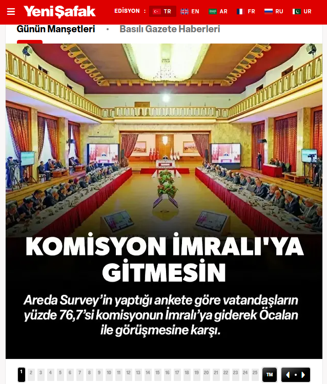 “Terörsüz Türkiye” sürecini yürüten Meclis komisyonunun İmralı’ya gideceği haberleri kamuoyundan tepki çekti. Areda Survey’in yaptığı ankete göre vatandaşların yüzde 76,7’si komisyonun İmralı’ya giderek Öcalan ile görüşmesine karşı. Görüşmenin sürece zarar vereceği endişesi var.”